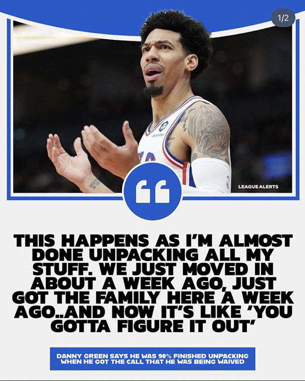 格林还表示:我那时候听到交易来了好几位球员,我就知道肯定要有人被裁了。在我接到裁员通知时,我几乎完成了90%的准备工作。我和家人们才刚在费城安顿好一切,一周前才搬进新居。那时候我的感受就是人有点懵,我得搞清楚。