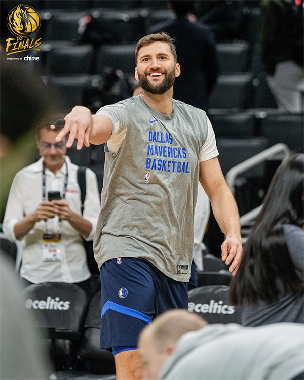 在波士顿TD北岸花园球馆,独行侠全队积极备战总决赛第五场,官推晒出东契奇坐在场边咧嘴大笑的画面;就是在这个位置,东契奇坐在替补席命中超远三分。