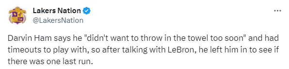 三节打完湖人落后21分,即使如此,詹姆斯仍旧继续在末节带队反扑,直到比赛还剩4分钟才放弃比赛,对此哈姆表示詹姆斯不想太早认输,他在做最后一搏。