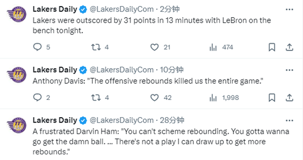 哈姆反复强调篮板被爆是湖人输球的首要问题;谈到本场失利,浓眉则表示:防守篮板上的挣扎是一个集体问题,每个人都需要解决,我们必须加强一些,但进攻篮板从头到尾都杀死了我们。