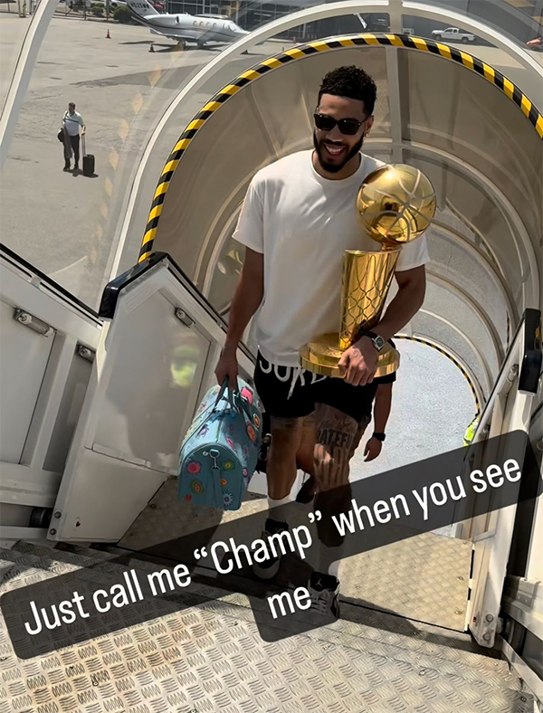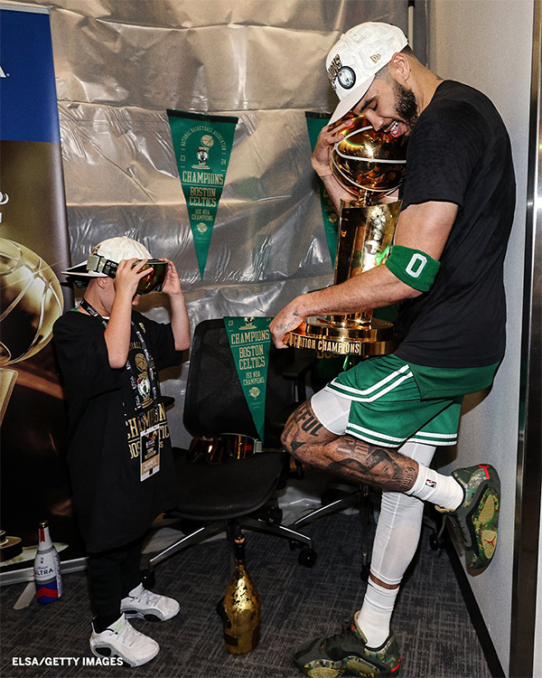 总决赛第五场,凯尔特人轻松击败独行侠从而4-1夺得总冠军,绿军夺冠后塔图姆笑着笑着就哭了,喜极而泣疯狂庆祝以及亲吻总冠军奖杯,为布朗赢得FMVP而鼓掌;在全队合影时,塔图姆抱着奥布莱恩杯,布朗抱着FMVP,两人并肩坐在一起。