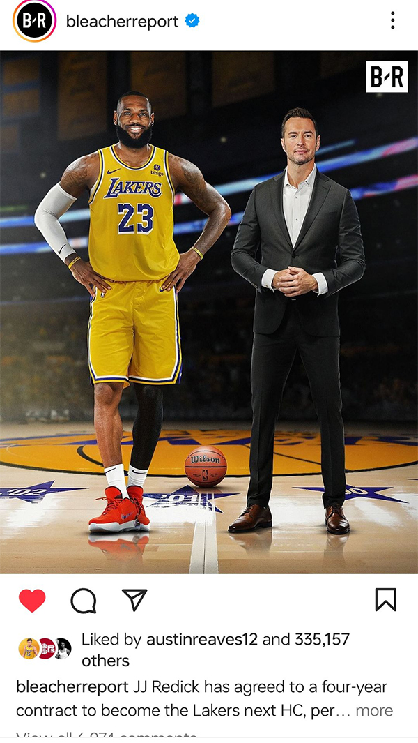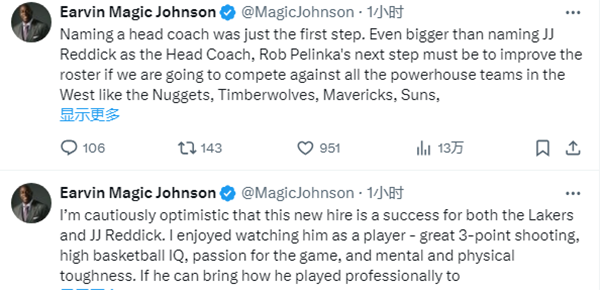 对于湖人聘请雷迪克,湖人名宿魔术师约翰逊发推写道:对于湖人和JJ -雷迪克的成功,我持谨慎乐观的态度。我喜欢看他打球的样子——出色的三分球命中率,高篮球智商,对比赛的热情,以及精神和身体上的坚韧。如果他能把他球员生涯的表现带到湖人——这是可行的!但是,他从明星球员到主教练的转变会不会像史蒂夫-科尔、杰森-基德、泰-卢、道格-里弗斯那样,或者像那些前NBA球员变成教练却不成功的人那样?