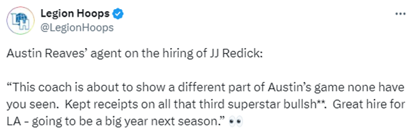里夫斯经纪人认为在雷迪克的执教下,里夫斯有望成为湖人第三巨头。
