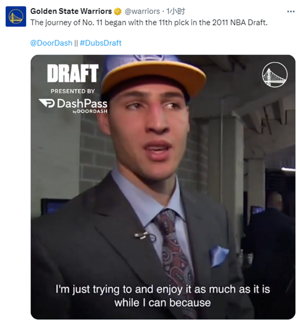 今日勇士官方发推晒出汤普森被选中的画面,配文写道:11号的旅程源于2011年的选秀大会上的11顺位。