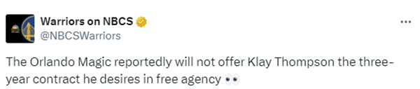 考虑到汤普森的年龄、伤病史以及最近的表现,魔术很可能在合同谈判中压价;34岁的汤普森想要至少3年合同,但勇士、魔术都只想给两年合同;另外值得一提的是,2023-24赛季初期,勇士曾提供2年5800万美元续约合同,但汤普森拒绝了。