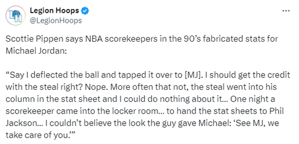 58岁的皮蓬公开表示90年代NBA的记分员伪造了乔丹的数据,在节目中表示:假设我把球断掉并传给了乔丹。按理说,抢断应该算我头上,对吧?不,通常抢断的记录会记在他的头上,我对此无能为力……