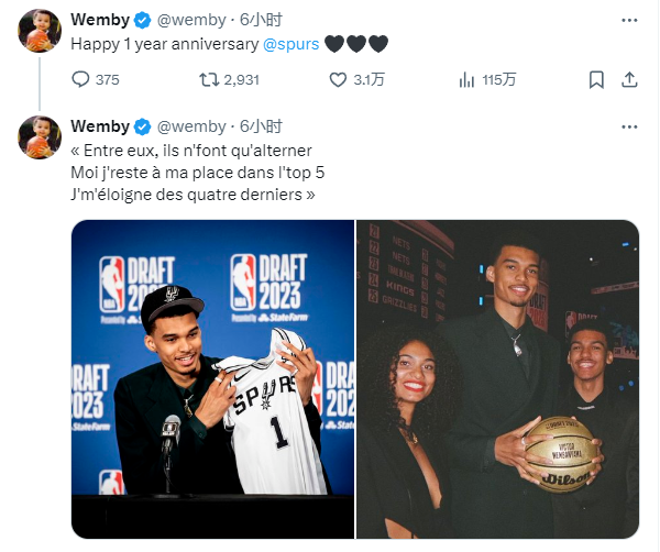 文班亚马庆祝被马刺选中一周年,晒照感慨