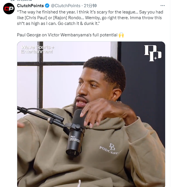 对于文班这样的超新星,快船球星乔治表示:他以这样的方式结束了这一年。我认为这对联盟来说很可怕,假设你有像保罗或者隆多这样的球员,文班,就站在那里。我会把这个球扔得尽可能高,他就能轻松空接扣篮。