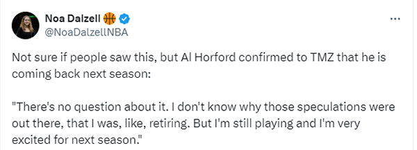 霍福德亲自辟谣退役传闻 宣布下赛季回归凯尔特人冲连冠