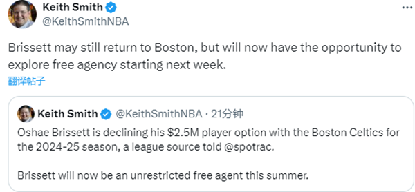 布里塞特试水自由球员市场,夺冠后肯定希望签下一份更大的合同;今夏,凯尔特人最多只能给他一份老将底薪合同,若布里塞特找不到更好的下家,他可能重新签约凯尔特人。