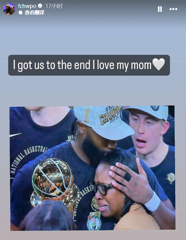 布朗晒出夺冠后自己抱着FMVP奖杯拥抱亲吻母亲的感人一幕,配文写道:我们笑到了最后,我爱你妈妈。