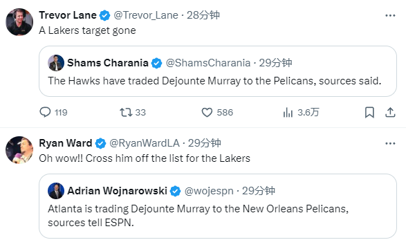 穆雷被交易到鹈鹕引热议,无数湖人球迷都不开心了;湖人记者Ryan Ward表示把他从湖人的目标名单上划掉吧;Trevor Lane表示湖人目标已经消失了。