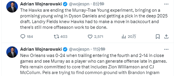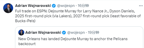老鹰后场双枪特雷-杨和德章泰-穆雷的组合正式解体,据名记woj报道,老鹰将德章泰-穆雷交易到鹈鹕,换来小拉里-南斯、EJ-利德尔、戴森-丹尼尔斯、2025年来自湖人的首轮签和2027年鹈鹕和雄鹿中顺位更低的那个首轮。