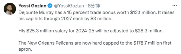 据薪资专家Yossi Gozla报道,穆雷获得15%的交易保证金,总额为1210万美元;如此一来,穆雷每年的薪水增加300万美元,24-25赛季的薪水从2530万美元涨到2830万美元,目前鹈鹕全队的总薪水为1.787亿美元。