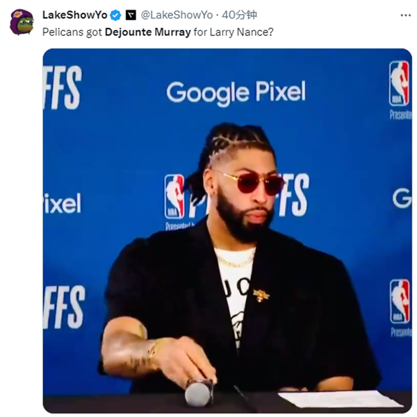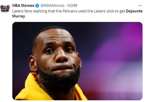 美媒表示湖人球迷才意识到鹈鹕利用湖人队的选秀权换来了穆雷。湖人球迷转发浓眉在发布上扔话筒的一幕,表示:鹈鹕只用小南斯就换来了穆雷?