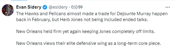 Evan Sidery报道,鹈鹕曾在今年2月份险些与老鹰达成关于穆雷的交易,当时鹈鹕拒绝交易赫伯特-琼斯,导致交易失败;如今鹈鹕在休赛期5换1成功引援穆雷。