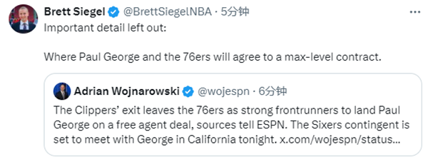 名记Brett Siegel报道,乔治和快船续约谈崩,透露了重要细节,保罗-乔治将和费城76人达成一份顶薪合同。不久前,快船随队记者Farbod Esnaashari报道,乔治和别队会面都是走形式,他已决定去76人。