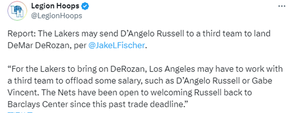 目前湖人正在兜售拉塞尔,他们的引援目标锁定德罗赞,据名记Jake Fischer报道,湖人可能将拉塞尔交易到第三方以获得德罗赞,该记者表示:湖人要想引进德罗赞,洛杉矶可能必须与第三支球队合作以减轻一些薪水负担,比如送走拉塞尔或文森特。自上个交易截止日期以来,篮网队一直愿意欢迎拉塞尔回到巴克莱中心。