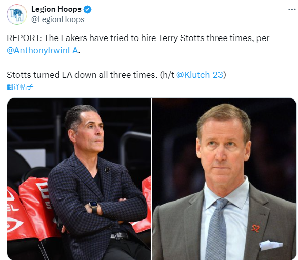 24直播网讯 湖人引援毫无进展,在聘请助教方面也是吃到闭门羹,据美媒Legion Hoops报道,湖人三次尝试聘请斯托茨担任助教,结果都被拒绝了。