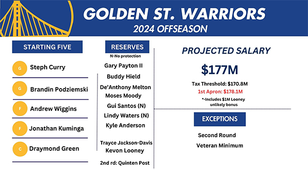 14名拥有保障合同的正式球员:库里、维金斯、库明加、波杰姆斯基、追梦格林、小佩顿、梅尔顿、穆迪、沃特斯、桑托斯、卢尼、特雷斯-杰克逊-戴维斯(TJD)、李凯尔和希尔德。