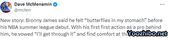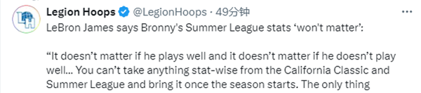24直播网讯 NBA夏季联赛加州经典赛,湖人94-108不敌国王,布朗尼全场出战21分钟,9投2中、三分3中0、罚球2中0拿到4分2篮板2助攻1抢断;赛后布朗尼透露自己有些紧张并相信自己能够克服;詹姆斯回应表示夏联打得好坏无所谓,相信儿子会越来越好的。