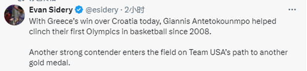 名记Evan Sidery表示字母哥带领希腊时隔16年重返奥运,美国男篮在冲冠路上又多了一个强有力的对手。