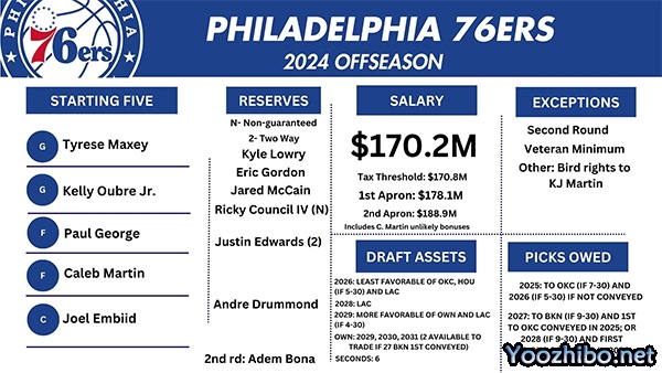 洛瑞1年合同续约回归,76人队现有正式球员分别是恩比德、乔治、马克西、乌布雷、马丁、洛瑞、戈登、德拉蒙德、麦凯恩、里奇-康西尔四世,10人阵容总薪资为1.702亿美元。