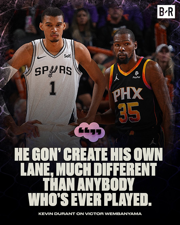 马刺双杀太阳赛后,杜兰特和文班亚马拥抱,之后杜兰特盛赞文班,表示:他是独一无二的球员,他将开辟出自己的道路,他与之前所有的球员都截然不同。你可以拿我跟他作比较,但他是一个独一无二的球员。