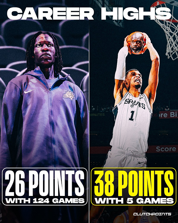 此前一战,马刺一度领先太阳多达27分,之后杜兰特和布克带队苦苦追分,追到末节终于扳平比分,不过关键时刻,文班亚马连得10分接管比赛,最终带队客场双杀太阳,文班全场26投15中、三分6中3轰下38分10篮板2助攻2盖帽1抢断。