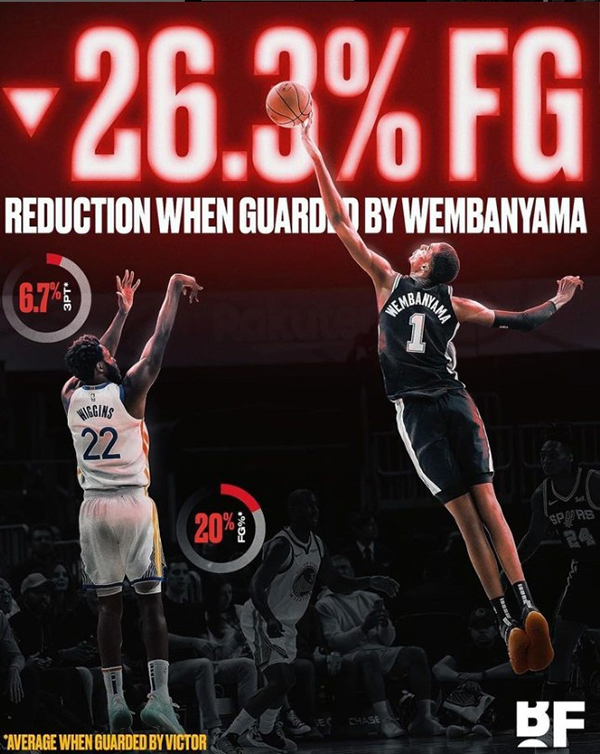 据统计,当面对文班亚马的防守时,球员命中率平均下降26.3%