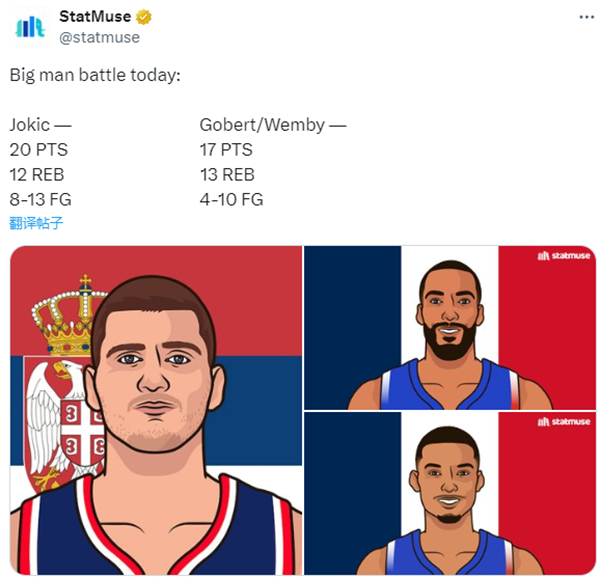 今日法国男篮在热身赛67-79不敌塞尔维亚,文班亚马全场拿到14分10篮板3助攻2盖帽,戈贝尔陷入犯规困扰仅仅拿到3分3篮板,约基奇13投8中独砍20分12篮板,一人数据碾压法国双塔,不过约老师在比赛还剩3分33秒时犯满毕业。