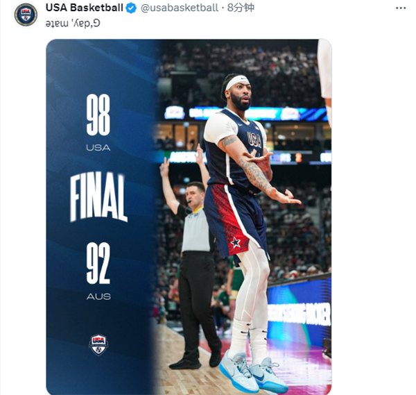 美国男篮获胜后,镜头拍到浓眉咧嘴大笑的画面,美国男篮官推晒出浓眉庆祝命中三分的画面,庆祝最终的胜利。