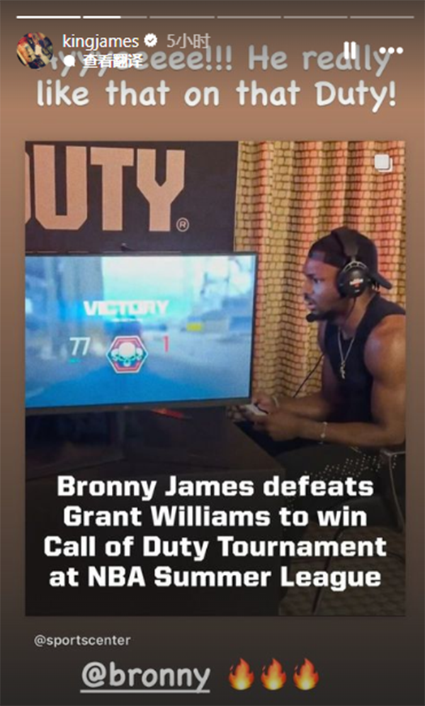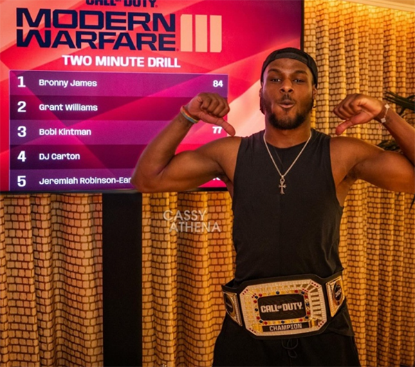 詹姆斯还祝贺布朗尼《使命召唤》夺冠,写道:耶,他真的那样肩负使命;布朗尼-詹姆斯在拉斯维加斯参加了《使命召唤》游戏活动,在活动中,布朗尼以84分的成绩力压格兰特-威廉姆斯夺冠,赢得了定制的使命召唤冠军腰带和10000美元的奖金。