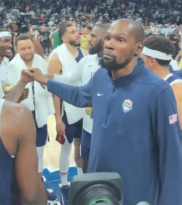 来源:24直播网07-16 11:3524直播网讯 北京时间7月16日,奥运男篮热身赛美国队6分险胜澳大利亚,杜兰特因小腿伤势继续缺战并且坐在替补席观战,赛后詹姆斯又召集全队开会,要求杜兰特投进一球后集合,KD轰进三分引詹库哈哈大笑。