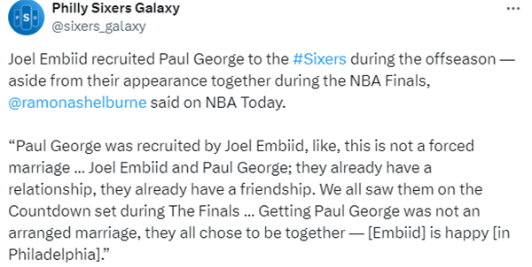Ramona Shelburne报道,除了在总决赛期间一起参加节目外,恩比德在休赛期招募了乔治,报道称:乔治是由恩比德招募的,就像这不是强迫婚姻,乔治和恩比德,他们之间已经有了关系和友谊,我们都在总决赛期间看到了他们,76人得到乔治不是包办婚姻,他们都选择在一起,恩比德在费城很开心。