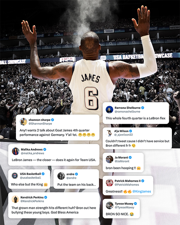 名嘴帕金斯:老詹欺负年轻人!上帝保佑美国!名记Shelburne表示:整个第四节就是勒布朗的展览;名嘴夏普:谁想聊聊GOAT老詹对阵德国第四节的表现;名记MalikaAndrews:詹姆斯——终结者——又一次为美国队做到了。