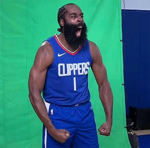 哈登首次穿快船1号亮相:拍定妆照握拳怒吼 笑着只露两颗大门牙