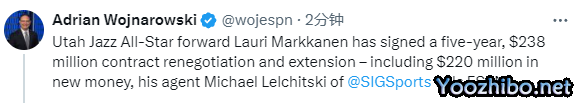 来源:24直播网08-08 10:1524直播网讯 勇士追求马尔卡宁正式失败,据ESPN名记woj报道,马尔卡宁已经和爵士达成5年2.38亿美元的提前续约合同,合同细节曝光,新赛季年薪4200万美元,没有任何选项。