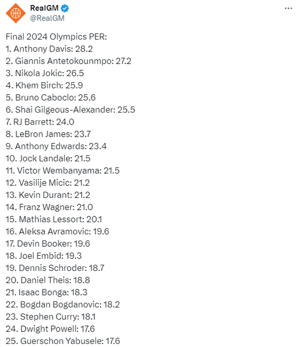 来源:24直播网08-15 11:3924直播网讯 2024年巴黎奥运男篮的球员PER(球员效率值)值出炉,美媒RealGM总结PER排名前25的球员,浓眉位居第一,约基奇第三,詹姆斯排在第8,杜兰特第12库里第23名。