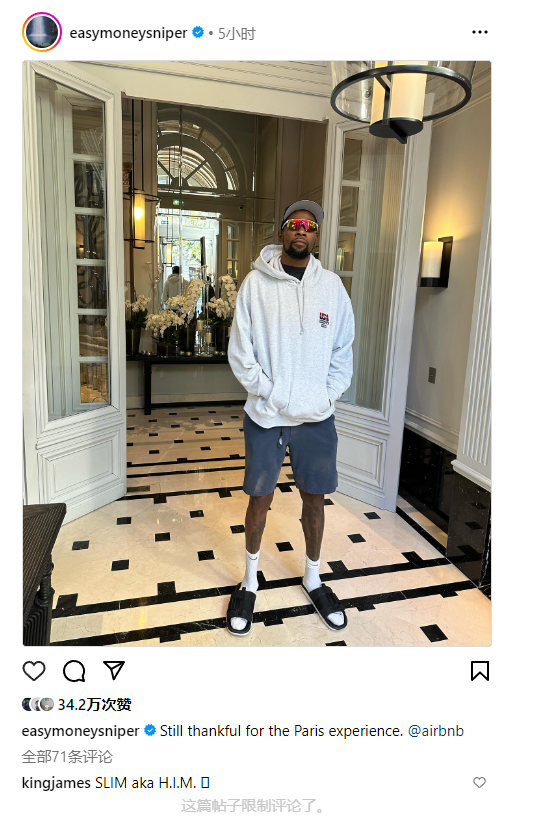 杜兰特更新社媒,晒出穿着拖鞋、短裤和连帽卫衣以及戴着眼镜和棒球帽的气质照,配文写道:仍然感激在巴黎的经历。