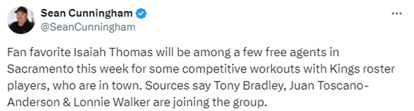 小托马斯现年35岁,身高1米75,生涯至今,为国王、凯尔特人、骑士、湖人、掘金、奇才、快船、鹈鹕、独行侠和黄蜂效力过,场均拿到17.5分4.8助攻2.4篮板;上赛季曾短暂效力太阳,仅仅出战6场,场均上场3.2分钟拿到1.3分。
