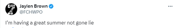24直播网讯 北京时间8月23日,新科FMVP杰伦-布朗发推写道:我的这个夏天真的很美妙,没骗你。