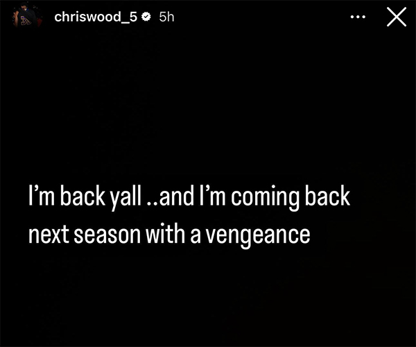 24直播网讯 北京时间8月25日,湖人球员克里斯蒂安-伍德更新动态,公开透露新赛季的目标,表示:跟你们说,我回来了,新赛季我将为复仇而回归。