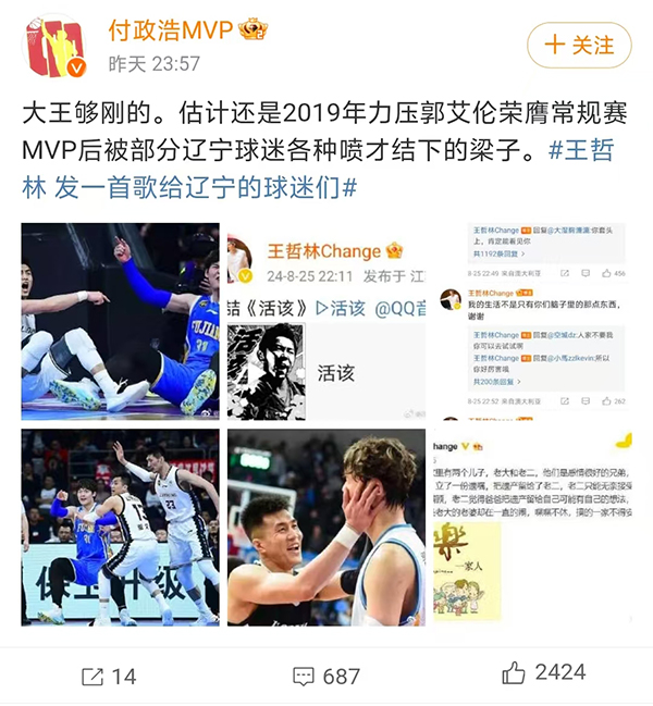 而就在这个时候,王哲林在社交媒体分享了歌曲《活该》,虽然歌曲并没有指向辽宁男篮和郭艾伦,但是这个时间节点还是很敏感的,特别是当王哲林被辽宁男篮球迷质疑后,王哲林公开的喊话:“发一首歌给辽宁的球迷发来了。”随后,王哲林也是和辽宁男篮球迷进行一番唇枪舌剑,王哲林这边似乎没有因为自己是公众人物就想要偃旗息鼓,反而王哲林没有惯着球迷,两者是有来有回,这也让王哲林和辽宁男篮球迷的争论是公开化了。
