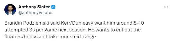 勇士跟队记者Anthony Slater报道,波杰姆斯基新赛季被球队要求大幅度增加他的外线使用率,意在尝试让他取代今夏离队的克莱-汤普森;波杰姆斯基透露勇士教练组希望他在新赛季场均可以出手8-10次三分球,并且让他减少抛投和勾手,多投中距离。