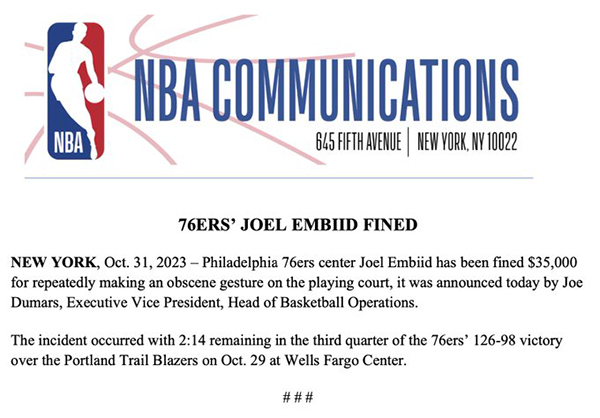 NBA官宣!哈登离队后恩比德吃罚单:因下流庆祝动作被罚3.5万美元