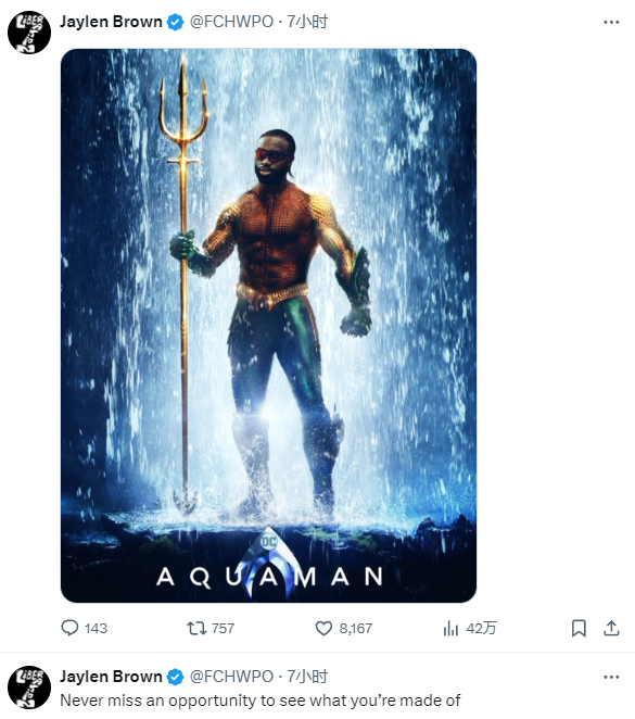 布朗自比海王,在推特上晒照把自己P成DC英雄海王,看来这段时间,布朗在水中的感受颇深啊。