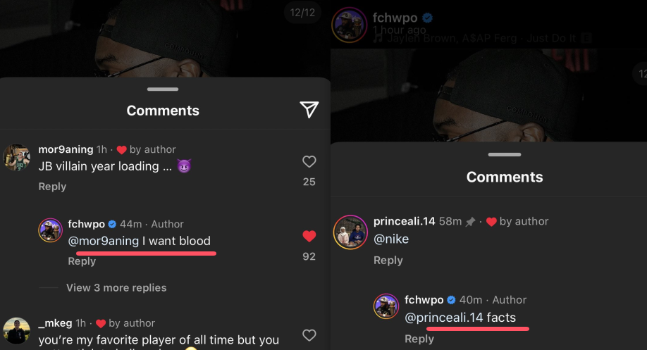 球迷在评论区写道:杰伦-布朗的大反派之年加载中,布朗回复道:我想要血;球迷把耐克标注为黑子,布朗回复:事实如此。