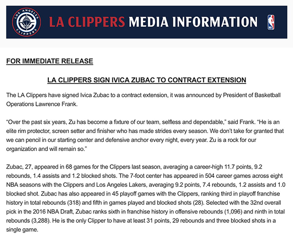 快船总裁劳伦斯-弗兰克发表声明,表示:在过去的六年里,祖巴茨已经成为我们团队的一员,他无私、可靠。他是一个出色的护框者、掩护者和终结者,每个赛季都取得长足的进步,祖巴茨是我们球队的一块基石并将继续如此。