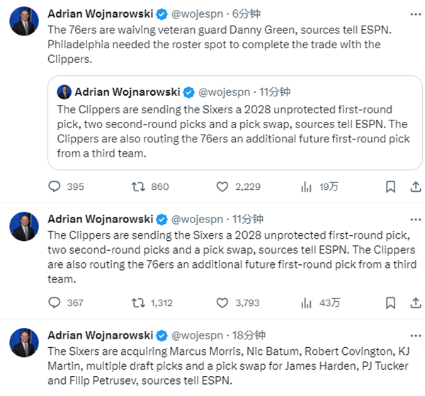 重磅!哈登和塔克被交易至快船,76人得到多个球员和选秀权